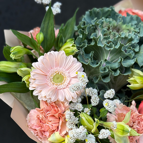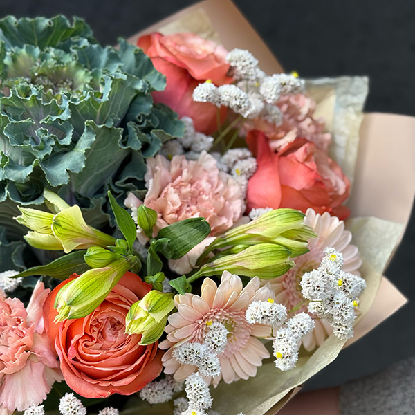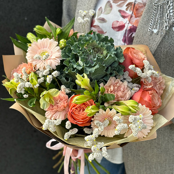 Bukiet z róż, alstromerii, goździków, gerberów, brassici i dodatków