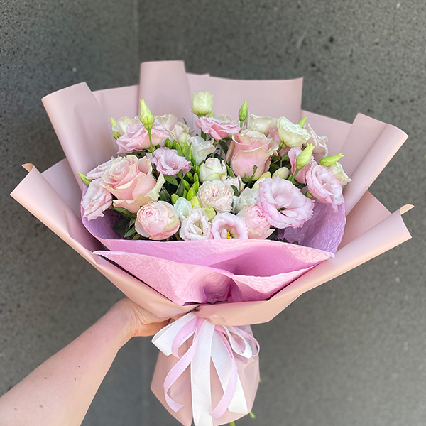 Bukiet z eustomą, różami, frezją w pudrowych odcieniach . Głównym akcentem w bukiecie są Piwonie. Piękne opakowanie w różowym kolorze dodaje objętość i harmonijnie podkreśla. Sprawia duże wrażenie i radość. Kolory kwitów można zmieniać za warunkiem ze są dostępne w określony dzień.