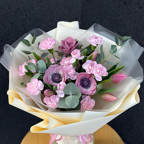 Mix anemonów, gołązkowych goździków, tulipanów oraz eukaliptusa