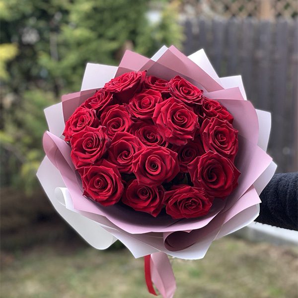 Bukiet składa się z 19 (PODSTAWOWY), 27 (ŚREDNI), 35 (DUŻY) czerwonych róż