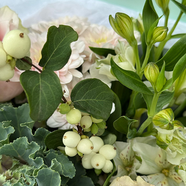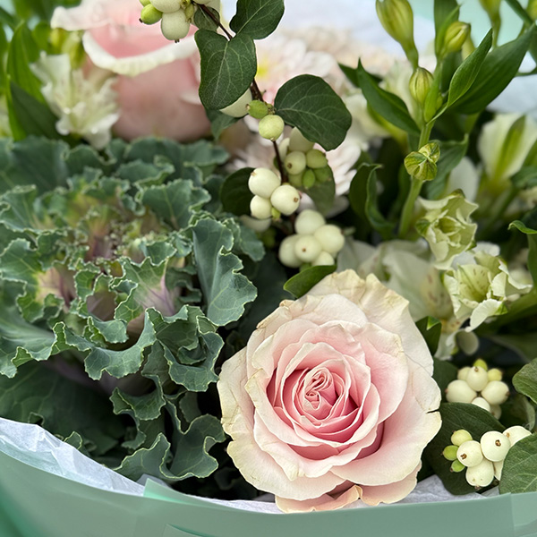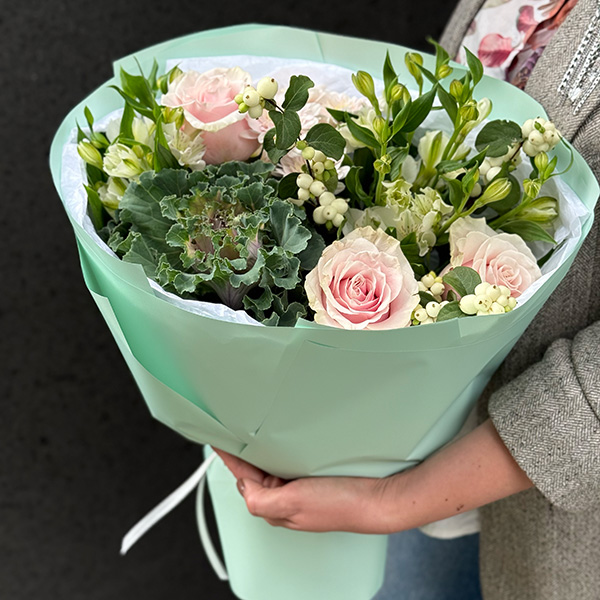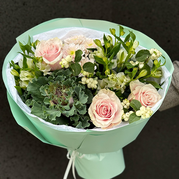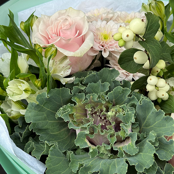 Bukiet z róż, alstromerii, chryzantemy, brassici oraz dodtków