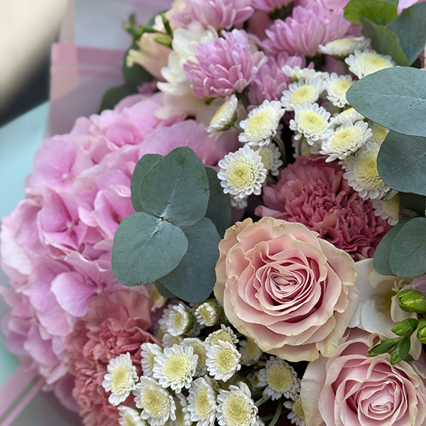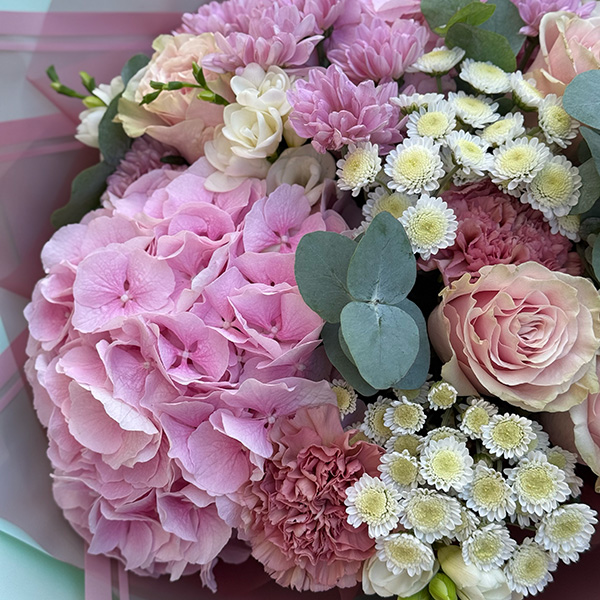 Bukiet z hortensji, chryzantemy, róż, goździków, frezji oraz dodatków