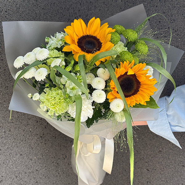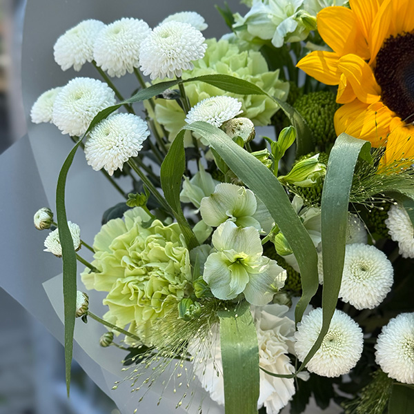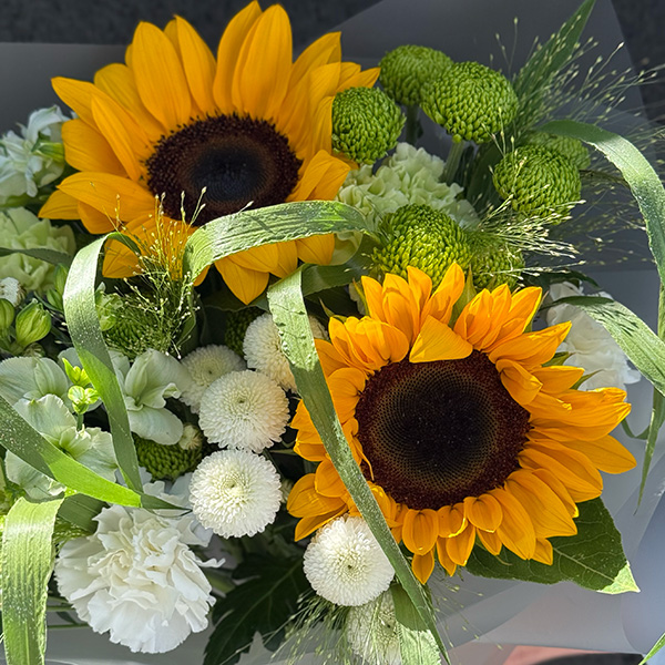 Bukiet z słoneczników, alstroerii, santini, goździkow, panikuma