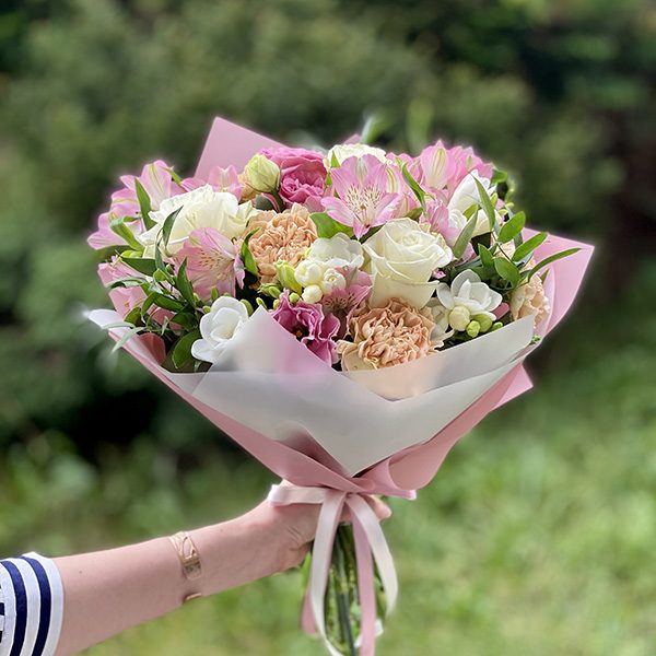 Bukiet składa się z róż, alstromerii, eustomy, goździków, frezji oraz zielonych dodatków