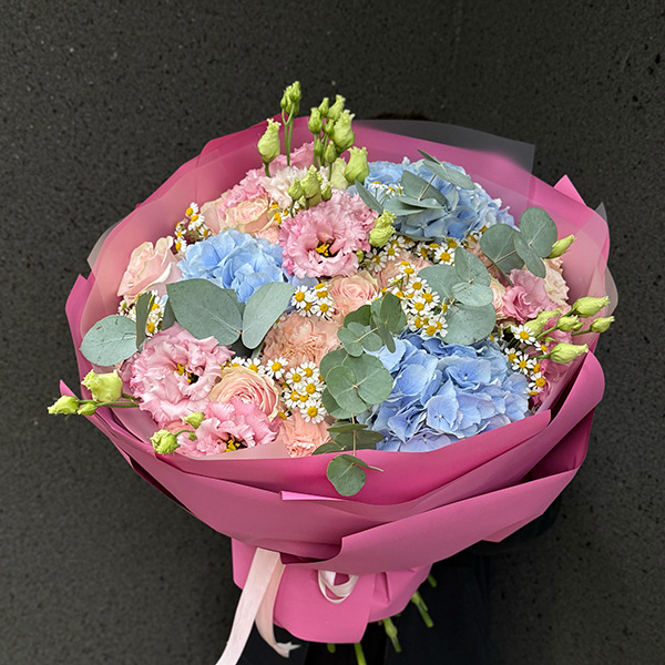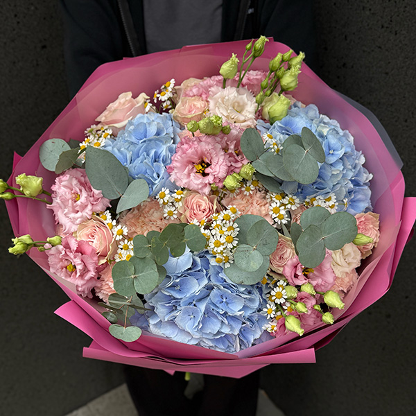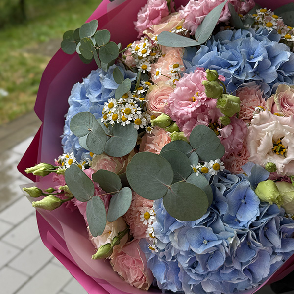 Bukiet z hortensji, eustomy, róż, astilbe oraz eukaliptusa