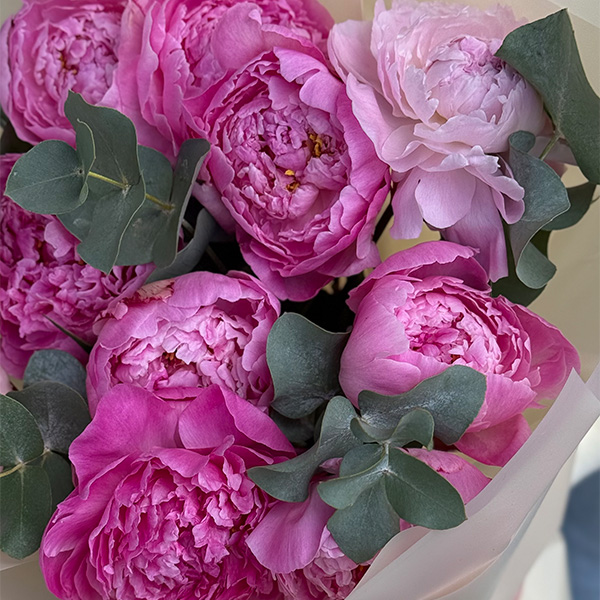 Bukiet składa się z piwonii oraz eukaliptusa.