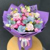 Bukiet składa się z niesamowitego diantusa odmiany Pastel Black oraz Violetta, róż, gałązkowych róż, eustomy oraz dodatków