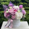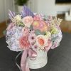 Flower-box z hortensją, różami, goździkami, eustomom, chryzantemom, eukaliptusem oraz dodatkami