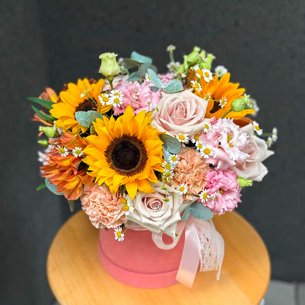 Fower box z hortensją, różami, eustomom, frezjami, diantusem oraz dodatkami w koszyku