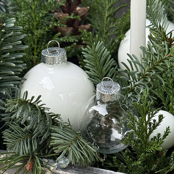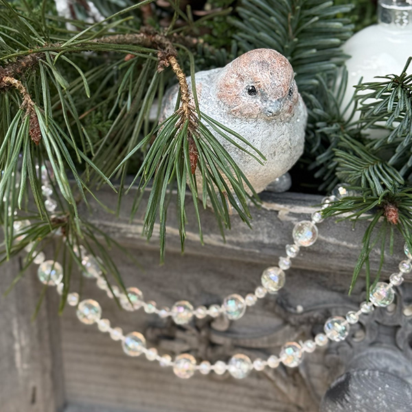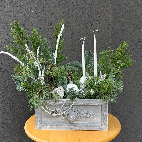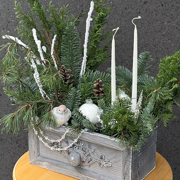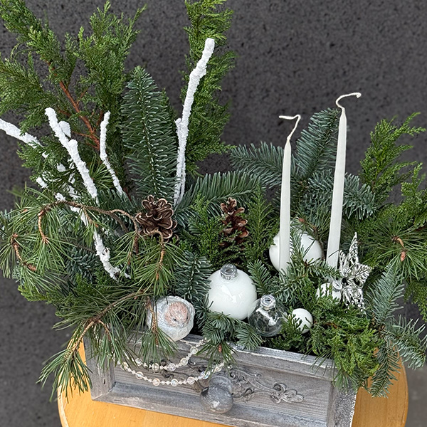 Kompozycja świąteczna z nobilisu ze świecami, ceramicznym ptakiem i dekoracjami w białym kolorze